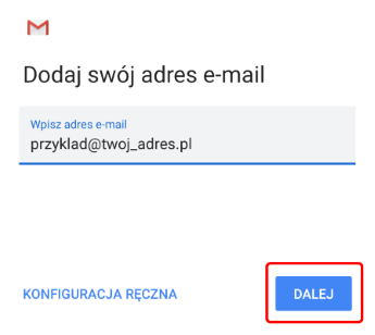 Teraz przechodzimy do podawania podstawowych danych konta. Wpisz adres e-mail Twojego konta pocztowego i kliknij "Dalej".
