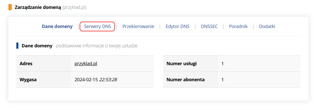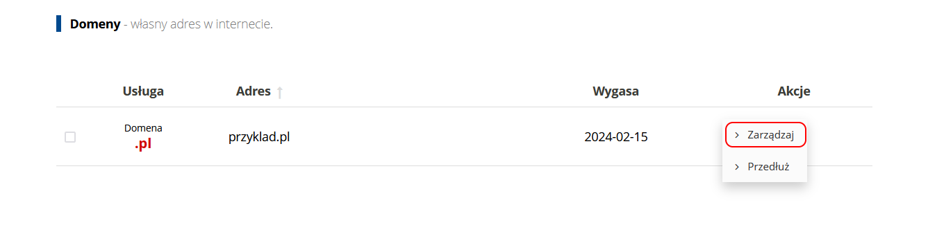 Aby to zrobić wejdź do panelu klienta i kliknij "zarządzaj" przy wybranej domenie:
